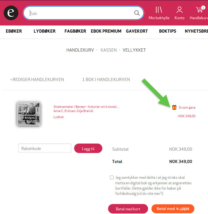 Velg boka, klikk deg videre, logg inn (eller opprett bruker), når du kommer til betaling, kan du velge å gi boka som gave (se skjermbildet nedenfor).
